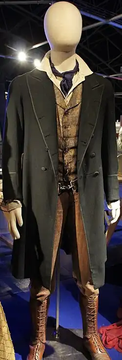 "The Night of the Doctor" was recorded at Roath Lock on 7–8 May 2013; the first day of filming consisted of all scenes taking place on the planet Karn, while the second day consisted of scenes in Cass' spaceship.[5] Rather than a return to the costume from the TV movie or using the new image that Big Finish had introduced, Moffat decided on a variation of the TV movie outfit designed by Howard Burden. The new outfit referenced the previous one, retaining the long green coat and grey waistcoat, but making it appear more of an "adventurer's" rather than "gentleman's" outfit.[1] At the same time, pictures of McGann in costume were taken on the Eleventh Doctor's TARDIS console room set.[6]