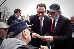 Executive producers Tom Hanks and Steven Spielberg talk with veterans of the World War II Pacific theater March 11 after a ceremony honoring the men at the World War II Memorial.
