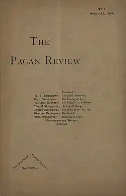 The first issue of The Pagan Review was published on 15 August 1892 and contained the following texts, all written by Sharp under a variety of pseudonyms.[3]