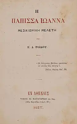 The Papess Joanne (Greek: Ἡ Πάπισσα Ἰωάννα, romanizedHē Pápissa Iōánna) is a 1866 novel by Greek writer Emmanuel Rhoides. Published with the subtitle "medieval study",[a] the novel is an exploration of the European legend of Pope Joan, a woman who allegedly ascended the church hierarchy and reigned as pope in disguise some time in the late 9th century. Though a romance with satirical overtones, it has been described as having elements of a chronicle because of the writer's extensive research of historical sources.[1] Due to its religious commentary, the novel attracted criticism from the Greek Orthodox Church which resulted to its excommunication by the Holy Synod. The Papess Joanne became the most famous of Rhoides' works and has been established as a classic of Modern Greek literature; It got translated into several languages, earning Rhoides international recognition and praise.[2][3][4]