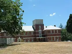 Lewis House, McDonnell House and Noble House (all 1915) are ward buildings of similar design, located along Barrett Drive. On the eastern side the buildings overlook lawns and the cricket oval. A service road runs along the western side and the surroundings of the buildings are paved in concrete with a raised garden strip containing mature trees between the buildings and Barrett Drive. Lewis House is situated between Kelsey House and McDonnell House and is a substantial two-storeyed rendered masonry building with a terracotta-tiled roof. It has gabled roofs with parapetted gable ends and subtle quoins on the upper floor. The southern elevation has a projecting wing with pyramid-roofed pavilions at each corner and small square windows. The rest of the building has large casement windows throughout and is smooth rendered to sill height on the second floor and roughcast above. A short verandah with vertical timber louvres is located on the ground floor of the eastern elevation. McDonnell House is situated between Lewis House and Noble House. It is also two-storeyed and constructed of masonry but is more rectangular in plan with three short wings projecting on the western elevation. It has a large gabled roof and gabled roofs on the western wings, all of which have overhanging eaves. The roof is clad in dark concrete tiles and the building is rendered smooth up to sill height on the second floor, above which it is roughcast. There are two ground floor verandahs on the eastern elevation overlooking the cricket oval, either side of a central projecting gable. Noble House is almost identical to Lewis House but a concrete tiled roof has replaced the terracotta roof and it has a longer verandah on the ground floor on the eastern elevation.[1]