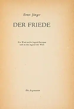"The Peace" (German: Der Friede. Ein Wort an die Jugend Europas. Ein Wort an die Jugend der Welt, lit. 'The Peace: A Word to the Youth of Europe: A Word to the Youth of the World') is an essay by the German writer Ernst Jünger. It was intended for Allied readers in the event of a German rebellion against the Nazi Party during World War II. It lays out a peace proposal and further visions that involve the creation of a European federation, which could take inspiration from Switzerland and the United States.[1] Similarly to Novalis in Christianity or Europe, Jünger argued that serious engagement with theology is more important than a constitution for upholding peace in Europe.[2]
