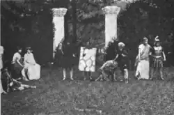 The college's 50th anniversary fell in 1915; by this point, the society had transitioned its focus exclusively to dramatic arts.[14] In 1890, when someone discovered that the term Philalethea was not proper Greek, the group changed its name to the more correct Philaletheis Society or Phil for short.[15][14] While the group had originally performed four shows per year, by 1915 it was down to three plays annually including one outdoors that was usually a Shakespeare show, and indoor productions of contemporary dramas, comedies, and older works such as The Critic and She Stoops to Conquer.[9][14] The year 1908 saw the abolition of the chapters and their plays, which had ostensibly come to serve as a proving ground for undiscovered Vassar women who wanted to take part in the larger productions sponsored by the entire Philaletheis organization.[16] The chapters' plays were prepared in just one week each leading to the criticism that their presentations were "hasty and patchy", and the establishment of competitive auditions for the main Phil plays rendered obsolete the model of chapter plays as proving grounds for new actresses.[16] The group had produced 147 full shows by this time.[17] A song in a marziale tempo, "Hail to thee, Philaletheis!", was published in 1908.[18]