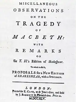 Johnson began work on Macbeth to provide a sample of what he thought could be achieved in a new edition of Shakespeare.[7] He got much of his information while working on the Harleian Catalogue, a catalogue of the collection of works and pamphlets owned by Robert Harley, 1st Earl of Oxford and Earl Mortimer.[7] He published this work, along with a commentary on Sir Thomas Hanmer, 4th Baronet's edition of Shakespeare's plays, as Miscellaneous Observations or Miscellaneous Observations on the Tragedy of Macbeth on 6 April 1745 by Edward Cave.[7]