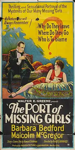 The Port of Missing Girls is a 1928 American silent drama film directed by Irving Cummings. It stars Barbara Bedford and Hedda Hopper, making it one of the rare occasions when Hopper actually starred in a film.[1]