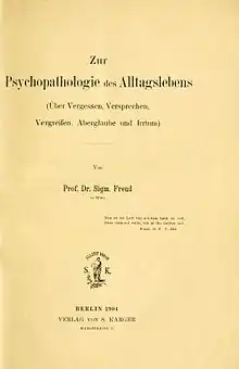 Psychopathology of Everyday Life (German: Zur Psychopathologie des Alltagslebens) is a 1901 work by Sigmund Freud, the founder of psychoanalysis. Based on Freud's researches into slips and parapraxes from 1897 onwards,[1] it became perhaps the best-known of all Freud's writings.[2]