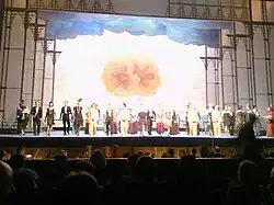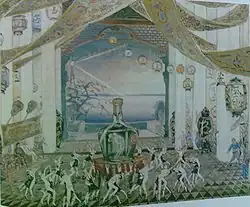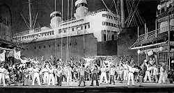 In 1943, the Ballet Russe de Monte-Carlo staged a one-act version of the ballet in the Public Music Hall in Cleveland, Ohio.[1] Premiering on October 9, 1943, the production was staged by Igor Schwezoff, with decor by Boris Aronson. Since World War II was being fought at the time, with the Soviets and Americans allied, the villain Li-Chan-Fou was changed to a Japanese bar owner. The group of Soviet sailors now included British and Americans as well.[2]