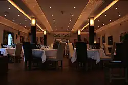 Following the 2004 redevelopment, the refurbished Rex is smaller, having 350 seats compared to the original capacity of 1100 (due to the larger leg-room and provision of swivel chairs and cocktail tables). The refurbishment was sympathetic to the cinema's Art Deco heritage, notably with the installation of a new chandelier and new period style mirrors. The work also brought about a major change to the building by separating the entire ground floor from the main cinema operation and converting it into a bar and restaurant. The decorated entrance foyer and dining room are now home to The Gatsby bar and restaurant, named in homage to the 1949 film The Great Gatsby whose poster hangs above the bar, in front of the former cinema entrance at the top of the (now disused) staircase.