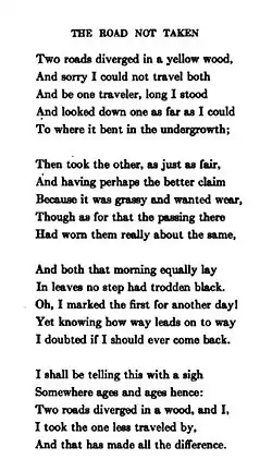 "The Road Not Taken" is a narrative poem by Robert Frost, first published in the August 1915 issue of the Atlantic Monthly,[1] and later published as the first poem in the 1916 poetry collection, Mountain Interval. Its central theme is the divergence of paths, both literally and figuratively, although its interpretation is noted for being complex and potentially divergent.