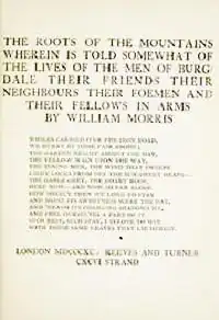 The Roots of the Mountains: Wherein is Told Somewhat of the Lives of the Men of Burgdale, Their Friends, Their Neighbours, Their Foemen, and Their Fellows in Arms is a fantasy romance novel by William Morris, perhaps the first modern fantasy writer to unite an imaginary world with an element of the supernatural, and thus the precursor of much of present-day fantasy literature.[1] It was first published in hardcover by Reeves and Turner in 1889.[2] Its place in the history of fantasy literature was recognized by its republication by the Newcastle Publishing Company as the nineteenth volume of the Newcastle Forgotten Fantasy Library in April, 1979.