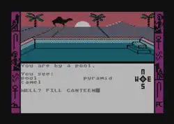 The Sands of Egypt is a 1982 graphic adventure game written by James Garon, Ralph Burris, and Steve Bjork of Datasoft for the TRS-80 Color Computer.[2] It was licensed to Tandy Corporation and was the first disk-only game for the Color Computer sold by RadioShack.[2] Ports to Atari 8-bit computers in 1982 and Apple II in 1983 were published by Datasoft. Set in 1893, the game follows a British explorer and archaeologist who is lost in the desert. Text commands are entered in the lower half of the screen, while a sometimes animated image of the current location is displayed in the upper half.