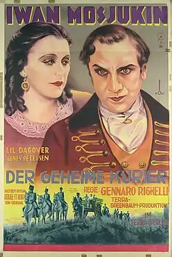 The Secret Courier (German: Der geheime Kurier) is a 1928 German silent adventure film directed by Gennaro Righelli and starring Lil Dagover, Ivan Mozzhukhin and Agnes Petersen.[1] It is based on the classic novel The Red and the Black by Stendhal, which Righelli later remade as a sound film The Courier of the King in 1947. The film was shot at the Terra Studios in Berlin. The film's art direction was by Otto Erdmann and Hans Sohnle.