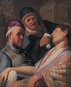 Unconscious Patient depicts a woman attempting to revive a man with smelling salts, as a barber-surgeon watches.[2] Long missing, it was identified when offered for auction in New Jersey, United States, in 2015,[2] with an estimate of $US500-800, titled "Oil on Board, Triple Portrait with Lady Fainting" and catalogued as "Continental School, 19thC., Appears unsigned", with no named artist, and as having "paint loss, some restoration to paint, [and] wood cracks".[3][8] It eventually sold, to the Leiden Collection, for an unknown sum, after achieving $870,000 at the auction,[8][9] and was subsequently cleaned, revealing its "brilliant palette, descriptive brushwork, and tightly arranged figures".[3]