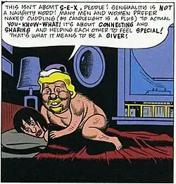 The comic's titular character is a pudgy, blond, bearded middle-aged man wearing a pink tank top and a lavender cap. He introduces himself in the story's first panel while perched at the top of a chimney in the middle of the night, in the manner of Santa Claus: