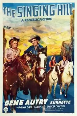The Singing Hill is a 1941 American western film directed by Lew Landers and starring Gene Autry, Smiley Burnette, and Virginia Dale.[1] Based on a story by Jesse Lasky Jr. and Richard Murphy, the film is about a singing cowboy and foreman of a ranch that may be sold to an unscrupulous banker by the young madcap heiress who is unaware that the sale will result in the local ranchers losing their free grazing land and their ranches.[2] In the film, Autry performed the 1940 song "Blueberry Hill", first recorded by Sammy Kaye, which would become a standard recorded by such artists as Louis Armstrong (1949), Fats Domino (1956), and Elvis Presley (1957).[N 1] The song became one of Autry's best-selling recordings.[4] In 1987, "Blueberry Hill" received an ASCAP Award for Most Performed Feature Film Standards on TV.[5][6]