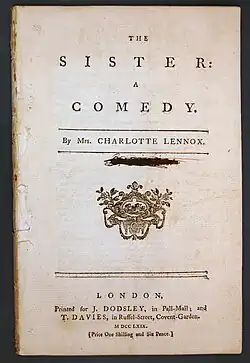 The Sister is a 1769 comedy play by the British writer Charlotte Lennox. Premiering at the Covent Garden Theatre, it was based on Lennox's own 1758 novel Henrietta.[1] The original Covent Garden cast included William Powell as Courtney, William Smith as Lord Clairville, Mary Bulkley as Miss Autumn, Sarah Ward as Lady Autumn and John Cushing as Will. However the play was received by a hostile, organised element of the crowd and was withdrawn after one night.