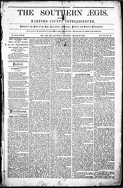 The Southern Aegis, and Harford County Intelligencer was a conservative Unionist newspaper which was published from March 22, 1862, to March 11, 1864, in Bel Air, Maryland by a prominent local lawyer, A.W. Bateman. After purchasing the paper as a pro-Confederate publication titled The Southern Aegis from John Cox in 1862, Bateman slightly altered the name of the paper as well as its political stance. In 1864, the title was again changed to the simplified The Aegis & Intelligencer, and Frederick W. Baker became the new publisher and editor.[1] Baker sold The Aegis & Intelligencer to John D. Worthington, Sr. in 1904, but kept its name until 1923, when it was changed to The Aegis.[2][3][4][5][6][7][8]