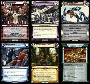 Playable cards come in several types, not counting Staples: Characters, Items, Tactics, and Locations. Each of these types often have subtypes. To win the game, the opponent's Faction must be reduced to 0 influence. The Tournament Faction starts with 25 influence. The Faction's influence may be reduced by attacking it with Characters, or by using Tactics or special abilities. Characters have three stats: Strength (amount of damage the Character deals), Life (amount of damage needed to destroy the Character), and Speed (faster Characters deal their damage earlier).[4] The combat system is simple in design, but with the ability to have multiple attacks during a turn, the party system and speed mechanic, the game allows for a deep and rewarding strategic decision tree that is "easy to learn, but difficult to master".