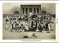 Serving as Director of Dramatic Action was Charles Burroughs; Mrs. Dora Cole Norman served as the Director of Dancing, with Richard Brown and Lenwood Morris as set decorators, including Mr. Augustus Granville Dill and J. Rosamond Johnson as Directors of Music.[2] Experiencing critical and artistic success, The Star of Ethiopia opening performance held in New York City on October 22, 1913, was deemed "an impressive spectacle…both from a historical point of view and as a forecast. by The Outlook (New York)[3] The performance held in Washington (1915), also had a well-received review being called "A remarkable spectacle of great educational value" by the Washington Board of Education President."[4] DuBois would write in The Crisis that the Philadelphia (1916) performance was "technically the best", with a writer from the Public Ledger stating "The intelligent interpretation which the thousand actors in the pageant gave of the authors thought was proof in itself that the Negros not the mentally torpid individual that prejudiced white folks persist in considering him."[4] Altogether, the three productions of The Star of Ethiopia would amass nearly 35,000 audience members in total.[4] The Star of Ethiopia was designed to appeal to mass audiences and was a large-scale presentation structured as a prologue and five scenes: