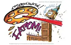 Davies' first drafts of the Dalek invasion and the Shadow Proclamation were fundamentally different from their broadcast counterparts. Instead of hearing the Daleks' repeated cry of "Exterminate", Captain Jack and Sarah Jane reacted to the sight of Dalek saucers. One saucer would descend towards Whitehall, destroy Big Ben in transit, and assassinate the Prime Minister, Aubrey Fairchild.[13][23] The Shadow Proclamation—defined in the script as an intergalactic police force that occupied a "huge installation, metal sci-fi towers ranged across a series of linked asteroids, hanging in space, like a Roger Dean painting"[2]—originally featured "every creature [the revival of the show] ever had"[24] and a cameo by Blon Fel-Fotch Pasameer-Day "Margaret Blaine" Slitheen (Annette Badland) as a Jingatheen (a Raxicoricofallapatorian family) toddler.[25] The number of monsters and the Proclamation's bureaucratic nature would anger the Doctor and cause Alonso Frame—now employed as a "Shadow Soldier"—to aid him in filling out paperwork.[17] Frame would be killed by the Daleks later in the story.[26]