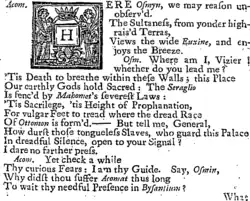 Like other plays set in Ottoman courts there may have been subtle parallels with contemporary British politics, particularly the divisions between George I and his son George, Prince of Wales. More strongly the play references the ongoing Austro-Turkish War and the role of Prince Eugene of Savoy who later that year won a major victory at the Siege of Belgrade.[3]