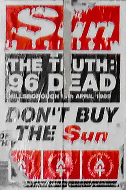 Widespread boycotts of the newspaper throughout Merseyside followed immediately and continue to this day. Boycotts include both customers refusing to purchase it, and retailers refusing to stock it.[88][89] The Financial Times reported in 2019 that Merseyside sales were estimated to drop from 55,000 per day to 12,000 per day, an 80% decrease.[90] Chris Horrie estimated in 2014 that the tabloid's owners had lost £15 million per month since the disaster, in 1989 prices.[88] Sales also declined to a lesser degree in neighbouring parts of Cheshire and Lancashire.[91] It was revealed in a documentary called Alexei Sayle's Liverpool, aired in September 2008, that many Liverpudlians will not even take the newspaper for free, or will burn or tear it up.[92] The paper is referred to by Liverpudlians as The Scum, with campaigners believing it limited their fight for justice.[93]