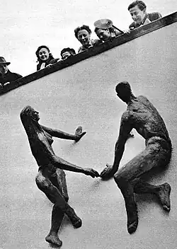 The full-size concrete work, made from "Peri-crete" a continuation of the artist’s Constructivist interest in the use of new materials, was mounted on a wall at the entrance to the festival site on the South Bank, at the gate on York Road near Waterloo station. Dylan Thomas mentioned the sculpture in an essay written after he visited the Festival, as "the linked terra-cotta man and woman fly-defying gravity and elegantly hurrying up a W.C. wall". The sculpture disappeared after the exhibition closed, and it was believed to have been lost.[1][2]