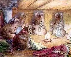 That night, the tailor falls ill and is stuck in bed for days, unable to work. By Christmas Eve the coat has still not been finished. During the night the mice sneak into the tailor's workshop and repay him by sewing together the coat. Seeing their kindness, Simpkin feels guilty and gives his master back the twist.