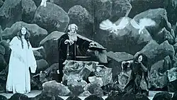 The British Film Institute describes Stow's The Tempest as "Comfortably the most visually imaginative and cinematically adventurous silent British Shakespeare film". Unlike William Kennedy Dickson's 1899 film version of King John and Charles Urban's 1905 film of The Tempest, both of which were simply films of Herbert Beerbohm Tree's stage productions, Stow's film was a condensed version of the entire play set specifically for the camera and tells the backstory (the film's first four scenes are set before the play starts) of how Prospero arrived on the island, his first encounter with Caliban and the discovery of Ariel.[4] Characters such as Duke Antonio are only sketched in while others such as Stephano and Trinculo do not appear at all and Percy Stow may have presumed that his audience would be familiar enough with the story to not require additional detail.[4][5] The Tempest was filmed in the studio and on location.[3][6]