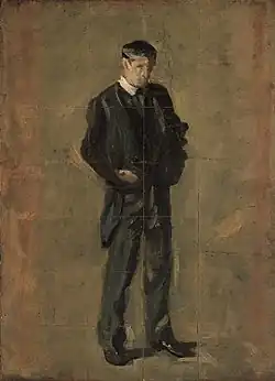 Of Eakins's full-length portraits, the subject of The Thinker: Portrait of Louis N. Kenton is the least well-known: "Among Eakins's scholars and thinkers, he may be the lone representative of the working class."[3] The painting is the sparest in presentation; it has no discernible narrative, nor do the setting or costume provide overt dramatic potential. Kenton stands at the center of the composition, looking down and inward, his hands thrust in his pockets. His casual and introspective pose sets a tone consistent with many of Eakins's paintings of people, in that it references and subsequently rejects the conventions of aristocratic portraiture.[3] With its contrast of the figure's dark silhouette and light, nondescript background, the painting suggests the influence of Velázquez.[3] For Eakins's biographer Lloyd Goodrich the similarities extend to the naturalistic verisimilitude and stylistic austerity of both artists' conceptions.[6] Admiration for Velázquez's virtuosity and restrained palette, shared by contemporaries such as Manet, John Singer Sargent and William Merritt Chase, is moderated in The Thinker by Eakins's adherence to his academic training, particularly apparent in the precise details of anatomy and dress.[1]