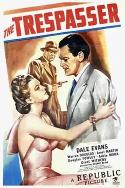 The Trespasser is a 1947 American action film directed by George Blair, written by Dorrell McGowan, Stuart E. McGowan and Jerome Gruskin, and starring Dale Evans, Warren Douglas, Janet Martin, Douglas Fowley, Adele Mara and Gregory Gaye. It was released on July 3, 1947, by Republic Pictures.[1][2][3]