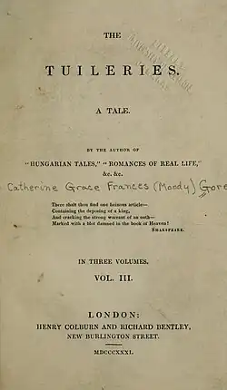 The Tuileries is an 1831 novel by the British writer Catherine Gore.[1] A bestselling writer of silver fork novels, Gore turned in this to the recent history of Paris following the French Revolution and particularly the Tuileries Palace. Gore herself had a low opinion of the work and when her publisher Richard Bentley asked her to write a review of it she declined, observing it was "a very dull work" and that she "could find little to say in its favour" concluding that "the public must be more dense than I dare hope, if they can be persuaded that it is really a work of interest".[2] It was one of two novels that Mary Shelley sent for in May 1831 along with Benjamin Disraeli's The Young Duke.[3]