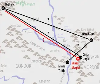 Tolkien initially considered choosing a pair from four towers. Three such pairs (Orthanc and Barad-dûr, Minas Tirith and Barad-dûr, or Orthanc and the Tower of Cirith Ungol, black lines) could have been the two used in the title.[2][3] But he settled on a different pair (red line), with Orthanc and a fifth tower, Minas Morgul.[4]