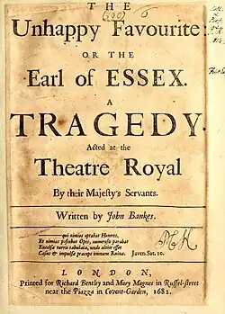 The first Drury Lane cast included Thomas Clark as The Earl of Essex, Philip Griffin as Earl of Southampton, Michael Mohun as Burleigh, Thomas Disney as Sir Walter Raleigh, Anne Marshall as Queen Elizabeth, Sarah Cooke as Countess of Rutland and Mary Corbett as Countess of Nottingham.[1] John Dryden wrote a special prologue for a performance attended by Charles II and his wife Catherine of Braganza.