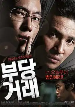 The Unjust (Korean: 부당거래; RR: Budanggeorae; lit. 'Bad deal') is a 2010 South Korean crime thriller film directed by Ryoo Seung-wan.[2][3][4] It is a dark and bitter denunciation of corruption in the South Korean justice system.[5][6] The film was a critical and commercial success, with 2.7 million admissions at the box office and winning several awards, including Best Film, Best Director and Best Screenplay at the 2011 Blue Dragon Film Awards.[7][8][9][10]