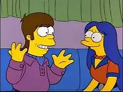 The television show that the Simpson family watches at the beginning of the episode, in which the two reviewers discuss the latest McBain film, is a parody of the American television series Siskel & Ebert & the Movies.[11] In the flashback sequence, Homer is seen singing along to the 1973 song "The Joker" by the Steve Miller Band while driving to school, which he also sings during the end credits.[12] Pink Floyd and Led Zeppelin posters hang on the wall of Homer's 1974 bedroom.[11] The 1970 song "(They Long to Be) Close to You" by The Carpenters is heard when Homer sees Marge for the first time.[1] Homer eats a bucket of Shakespeare Fried Chicken when he reveals his feelings towards Marge to Grampa. At the debate, Homer disagrees about the idea of lowering the United States national speed limit to 55 mph (89 km/h), arguing that "Sure, it'll save a few lives, but millions will be late!" This is a reference to the National Maximum Speed Law provision of the 1974 Emergency Highway Energy Conservation Act, which (at the time) prohibited speed limits higher than 55 everywhere.[11] Barney asks a girl named Estelle if she wants to go to the prom with him, but she tells him she would not go to the prom with him even if he were American actor Elliott Gould.[11] Artie says he can think of a dozen highly cogent arguments to why Marge should accept his prom offer, one of which is from a Time magazine titled "America's Love Affair with the Prom: Even wallflowers can look forward to one date a year."[11] Songs played in the episode include "The Streak" by Ray Stevens, "Goodbye Yellow Brick Road" by Elton John,[13] "Colour My World" by Chicago,[14] "Pick Up the Pieces" by Average White Band,[13] and "The Hustle" by Van McCoy.[1] Marge's car is an AMC Gremlin.