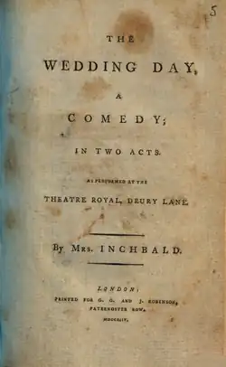 The Wedding Day is a comedy play by the English writer Elizabeth Inchbald.[1] An afterpiece, it premiered at the Theatre Royal, Drury Lane in London on 1 November 1794. The original cast included William Barrymore as Lord Rakeland, Thomas King as Sir Adam Contest, John Hayman Packer as Mr Millden, Charles Kemble as Mr Contest, Charlotte Tidswell as Lady Autumn, Dorothea Jordan as Lady Contest, Elizabeth Hopkins as Mrs Hamford and Elizabeth Heard as Hannah. The Irish premiere took place at the Crow Street Theatre in Dublin on 15 February 1797.[2]