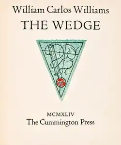 The Wedge is a 1944 book of poems by American modernist writer and poet William Carlos Williams. He assembled this collection in response to requests from American servicemen during World War II for a pocket-sized collection of his work to take into deployment with them. Despite the poet's inquiries and the nature of the requests that prompted him to approach them, several publishers rejected The Wedge. Their grounds for doing so were a perceived lack of literary quality and wartime shortages. The book was eventually handset printed by Henry Duncan and Wightman Williams at Cummington Press and bound surreptitiously on the premises and at the expense of one of the publishers who had previously rejected it. The book is dedicated to poet Louis Zukofsky, who helped Williams revise and rearrange the poems for publication.