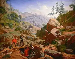 The fourth section included paintings that portrayed the successful lives of miners and settlers and depicted the give-and-take of American frontier democracy; also included were popular culture and advertising images.[4] Works in this section included George Caleb Bingham's Stump Speaking (1853–1854) and Canvassing for a Vote (1851–52), John Mix Stanley's Oregon City on the Willamette River (1850–1852), Charles Nahl and Frederick August Wenderoth's Miners in the Sierras (1851–1852), Mrs. Jonas W. Brown's Mining in the Boise Basin in the Early Seventies (c. 1870–80), and George W. Hoag's Record Wheat Harvest (1876).