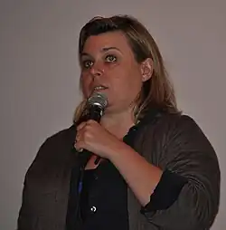 Middle-aged woman with short, very-light hair speaking into a microphone.