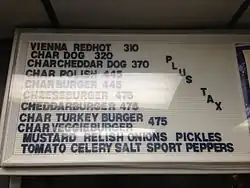The establishment is known for its char-grilled food, especially its hot dogs and hamburgers (commonly called char-dogs and char-burgers).[5] A Wieners Circle char dog with "the works" is a grilled Vienna Beef hot dog on a warm poppy seed bun, topped with mustard, onions, relish, dill pickle spears, tomato slices, sport peppers and a dash of celery salt.