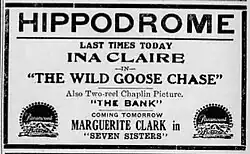 The Wild Goose Chase is a 1915 American comedy-drama film directed by Cecil B. DeMille. The film was written by DeMille's brother William and starred Ina Claire. The Wild Goose Chase is now considered a lost film.[1][2][3]