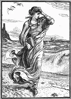 Further along the walk, by the seashore, the Wise Princess saw a child drowning. She jumped in the water and saved the child, but the waves were too high to save herself. Death came to see her and said “I will teach you all you want to know”.[1]