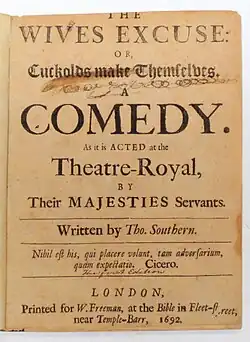 The Wives Excuse also The Wives Excuse; Or, Cuckolds Make Themselves is a 1691 comedy play by the Anglo-Irish writer Thomas Southerne. The title is sometimes written more grammatically as The Wives' Excuse.