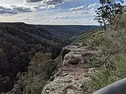 From near the Boolijah Peak, The Wool Road diverged from the current route of the Braidwood Road and followed the route of modern-day Wandean Road, through the steep Wandean Gap.[13] (historically also known as the Jerrawangala Gap[14]), then following ridgelines of tributaries of Wandandian Creek, to Wandandian.[13] In this section, the road's elevation dropped by approximately 2,500 feet in 10 miles[14] (760m in 16 km), as it descended the coastal escarpment, via the locality of Jerrawangala and Wandandian. Most of this part of the route is now only accessible to four-wheel drive traffic.[15]