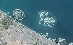 The World Islands (Arabic: جزر العالم, romanizedJuzur al-Ālam) are an archipelago of small artificial islands constructed in the shape of a world map, located in the Persian Gulf, off the coast of Dubai, United Arab Emirates.[1] The World Islands are composed mainly of sand dredged from Dubai's shallow coastal waters and are one of several artificial island developments in the emirate.[1] The World's developer is Nakheel Properties. Construction was done by two Dutch joint-venture specialist companies, Van Oord and Boskalis, who also created the Palm Jumeirah.