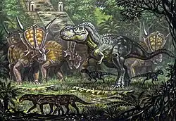 The original King Kong (1933) features a set of surviving Mesozoic animals inhabiting the island of Skull Island. During the production of its remake King Kong (2005), the production team decided that the animals presented in the new film were to be descendants of Mesozoic animals who had evolved in the intervening millions of years, rather than evolutionary stagnant survivors.[3] The design team at Wētā Workshop, responsible for the animal designs to be featured in the film, were inspired by the speculative evolution works of Dougal Dixon, especially his book The New Dinosaurs (1988), which speculated on what forms non-avian dinosaurs might have evolved into if they had not gone extinct at the end of the Cretaceous.[4][5]