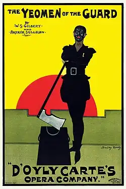 The Yeomen of the Guard was immediately a hit in London, with a successful New York run following shortly thereafter. Percy Anderson designed the original costumes, while the set was by Hawes Craven.[8] The first English provincial tour opened in 1888, and from then on it was a fixture in the D'Oyly Carte repertory, with at least one official touring company playing it somewhere in almost every season until the company's closure in 1982. New costumes were designed by Anderson in 1919 and 1927, and Peter Goffin designed new sets and costumes in 1940.[8] In Australia, the opera's first authorised performance was on 20 April 1889 at the Princess Theatre, Melbourne, produced by J. C. Williamson, which gave regular performances thereafter in Australasia until the 1960s. In 1932, Yeomen became the first Gilbert and Sullivan opera to be broadcast on the radio in its entirety.[9]