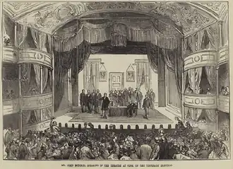 ![]() John Mitchel speaking at the Theatre Royal in Cork in early 1875 | |