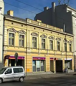 This tenement stands at the corner of Jagiellońska street and Theatre Square. From 1789 to 1800, on the place stood a storehouse and a stable. In 1853, a new building was erected, it survived until 1912. This year, a new edifice has been built by Rudolf Kern following a design of architect Heinrich Gross: the client was Otto Pfefferkorn, owner of a successful furniture factory.[8][10] Minor works have been performed in 1922-1923. In 1940, arcades designed by Jan Kossowski have been added at ground level at the request of the Nazi authorities: the project comprised also the opposite building with the same features.